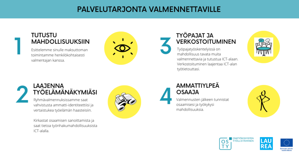 Onko sinulla hankaluuksia löytää paikkaasi työelämässä työkyvyn haasteiden vuoksi? Etsimme nyt talven valmennusryhmään henkilöitä, jotka ovat osatyökykyisiä ja kiinnostuneita ICT-alasta sekä haluavat työllistyä Uudenmaan alueelle.