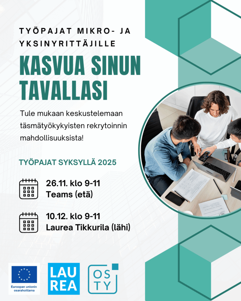 Järjestimme syksyllä 2025 mikro- ja yksinyrittäjille suunnattuja työpajoja. Työpajat tarjosivat tietoa ja keskustelua kasvun merkityksestä, rekrytoinnin esteistä ja osatyökykyisten rekrytoinnista.